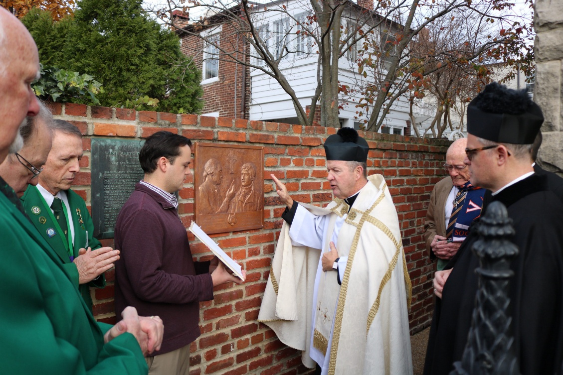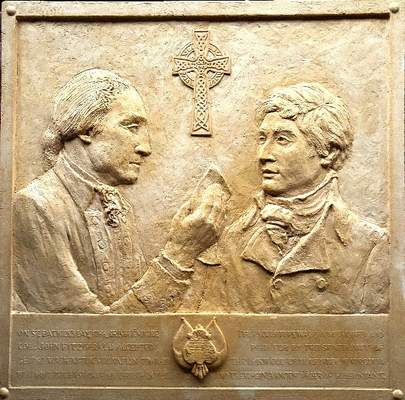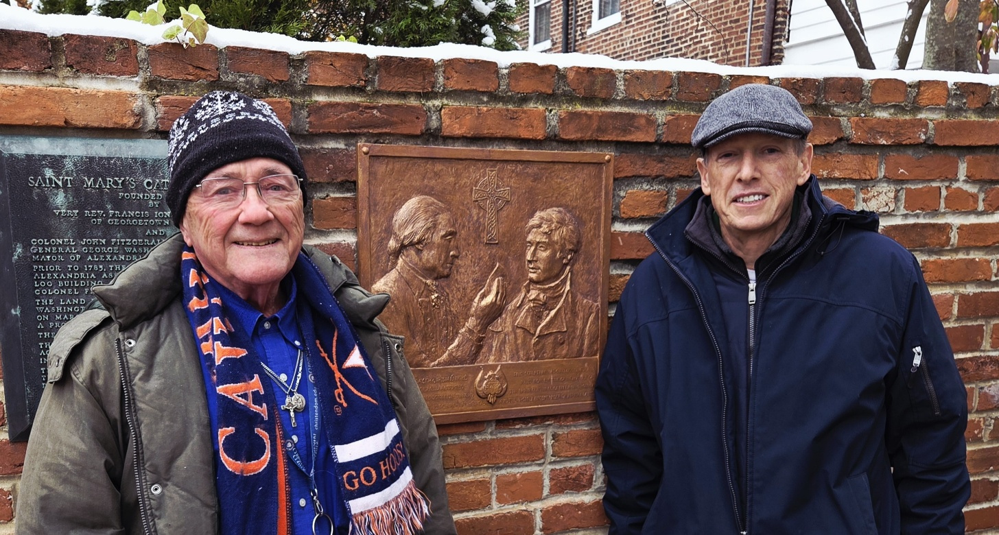 The bronze raised relief sculpture was installed at the Basilica of Saint Mary in Alexandria on December 6, 2025. It depicts St. Patrick Day 1788 when Fitzgerald accepted the first donation toward building the church from George Washington. The sculpture was blessed by Very Rev. Father Hathaway.