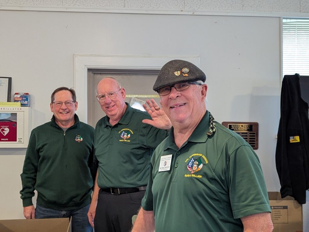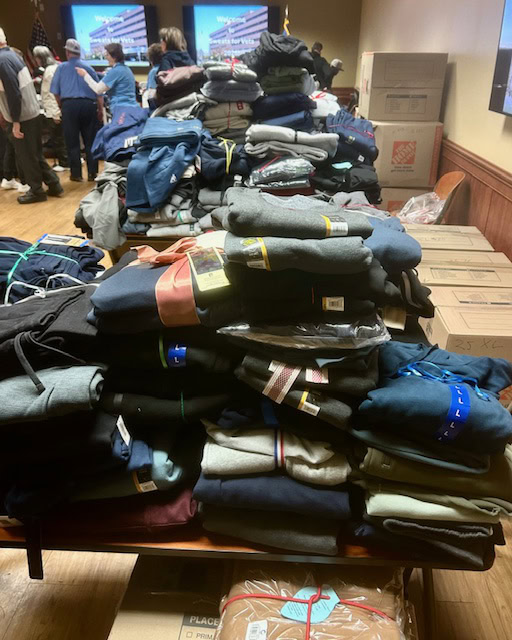 For 19 years, Sweats For Vets has assisted our veterans and our needy community. The day after Christmas brought tons of volunteers together, including the AOH, LAOH, KofC, and military groups such as the VFW and American Legion. Hundreds of sweat outfits were donated, bought, delivered, and packaged. These items were then loaded and transported to Martinsburg Veterans Hospital in West Virginia on January 24th. In addition to the clothes, pairs of socks, “thank you” letters to the troops from neighboring youth groups/schools, and over $6000 in donations were delivered. Well done, and thank you, to Dan Gillespie and to Jay McCarthly of the Cunningham Division, and to all who helped make this event possible.
